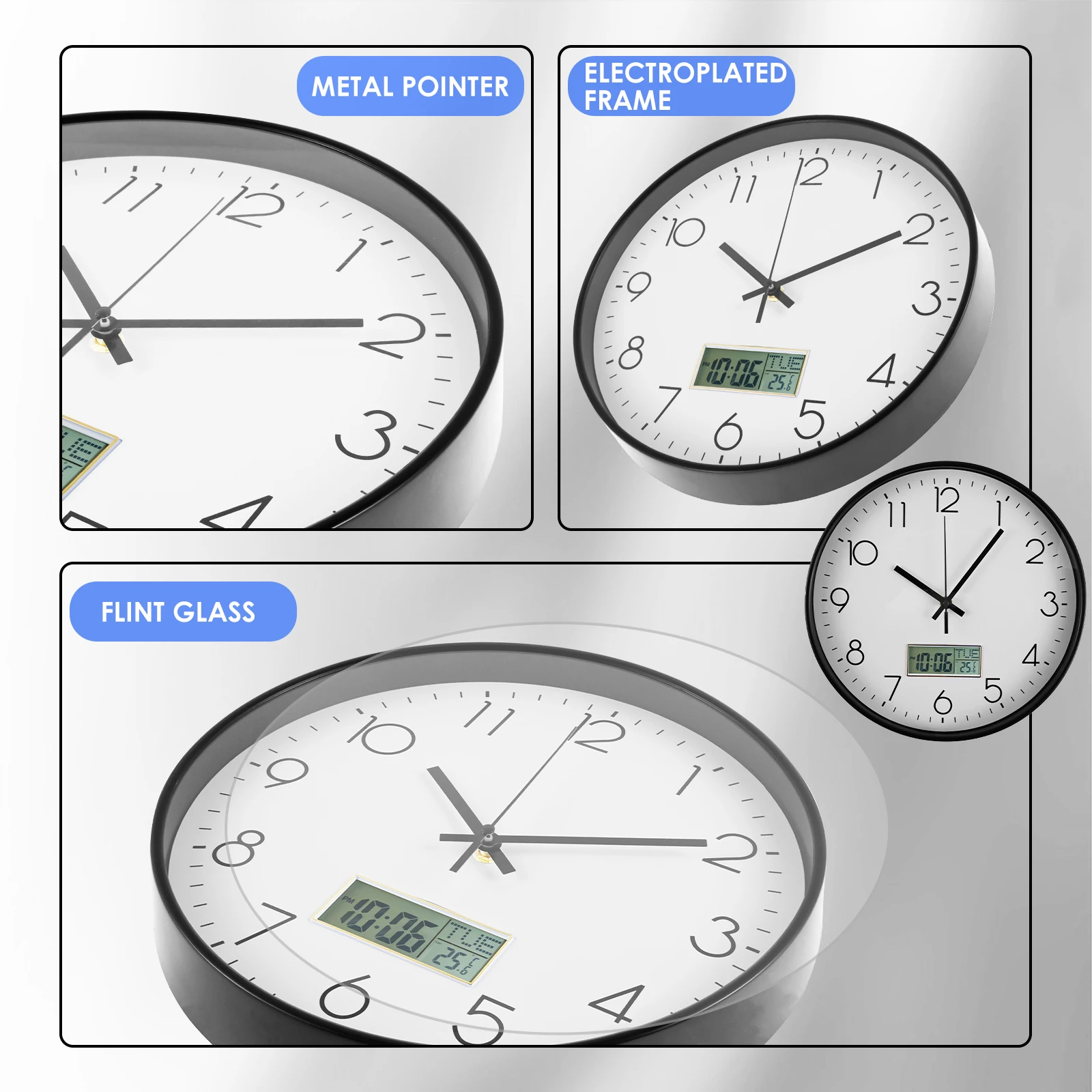 [Perpetual Calendar and Temperature] Our wall clocks feature a large LCD display with bold fonts that is easy to read from a distance and displays the month, date and real time Fahrenheit temperature. Note: If the initial temperature display is in Celsius, double click the "UP" button to toggle between Celsius and Fahrenheit.