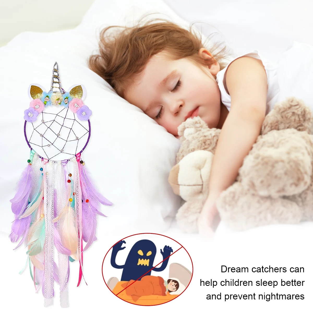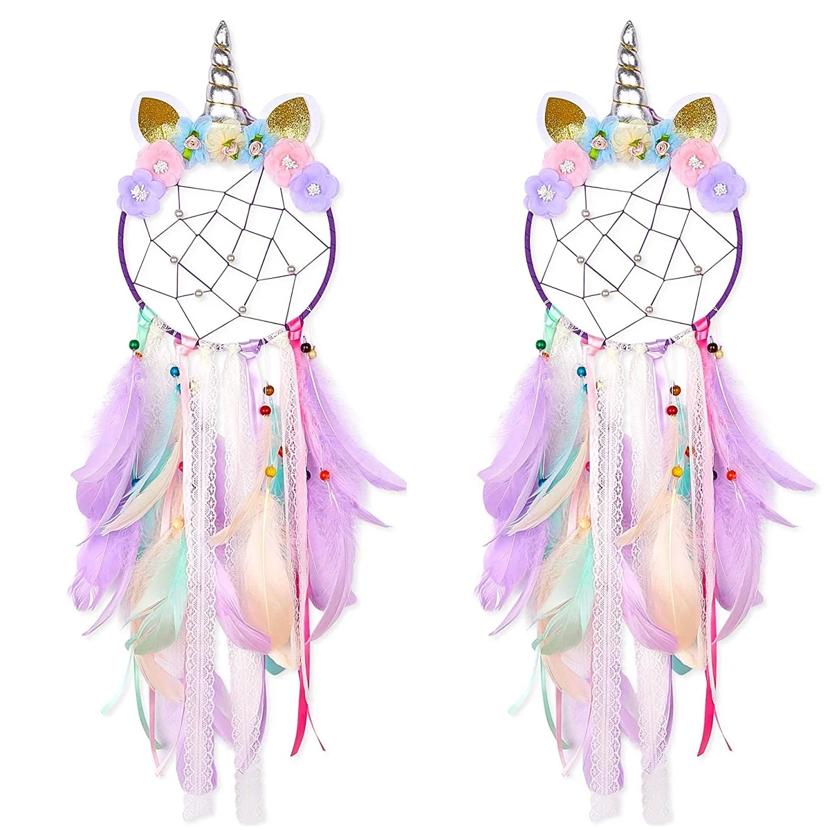 【Great Gift】Kids love unicorns and will definitely love the rainbow unicorn dream catcher at the first sight! It is a perfect craft gift for children, lovers or friends as a gift of love and surprise for Thanksgiving, Christmas, birthday and other festivals.【Unique Design】The unicorn dream catcher is carefully woven by hand. There are flowers, silver unicorn horns and golden ears around it, and the net is decorated with imitation pearls and colorful feathers and ribbons, dreamy and cute.【Size & Color】The diameter of the dream catcher's ring is about 7.9" and the total length is about 29.5". It is light weight, easy to hang on the wall, ceiling or window frame. There are 2 colors for you to choose from, purple and pink.【Keep Bad Dreams Away】This net will catch your nightmares and throw them out the window, allowing only good dreams to pass through and protect your children. Don't have terrible dreams at night.【Wide Application】With this wall hanging, you can instantly add vibe to your room. Very suitable as a wall decoration for a little girl's bedroom. Ideal for any bedroom, living room, study, office, children's room, etc., and even a wedding and party decoration.【Great Gift】Kids love unicorns and will definitely love the rainbow unicorn dream catcher at the first sight! It is a perfect craft gift for children, lovers or friends as a gift of love and surprise for Thanksgiving, Christmas, birthday and other festivals.