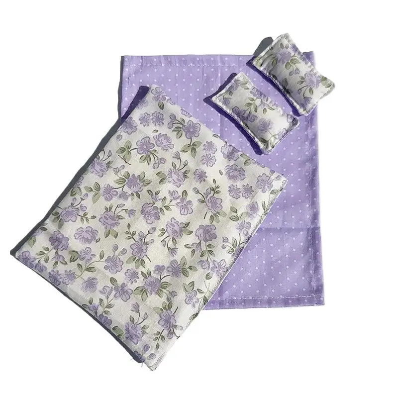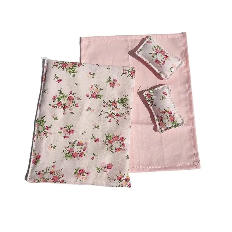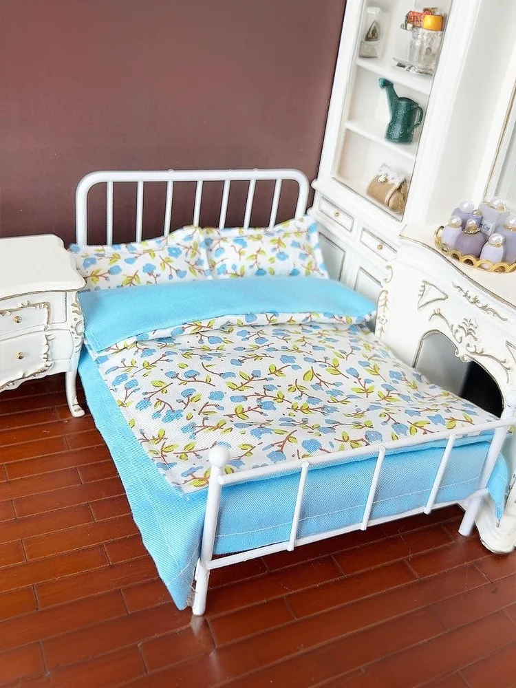 Four Piece Bed Set: Miniature Bed, Bed Sheet, Quilt & Pillow with Quilt Cover – Dollhouse Bedding Set for Doll Bedroom Decoratio