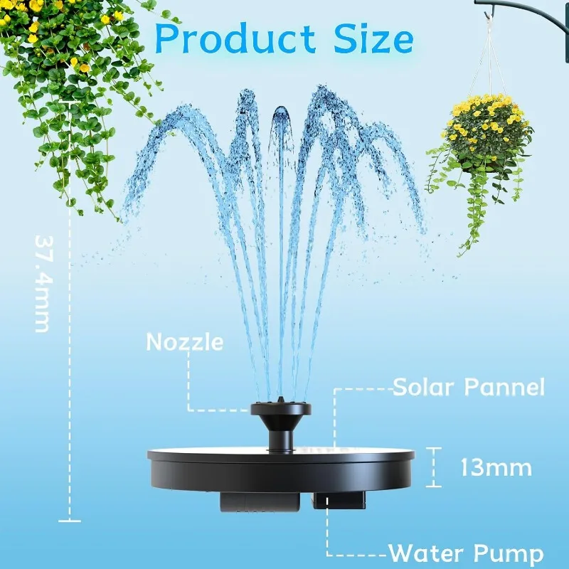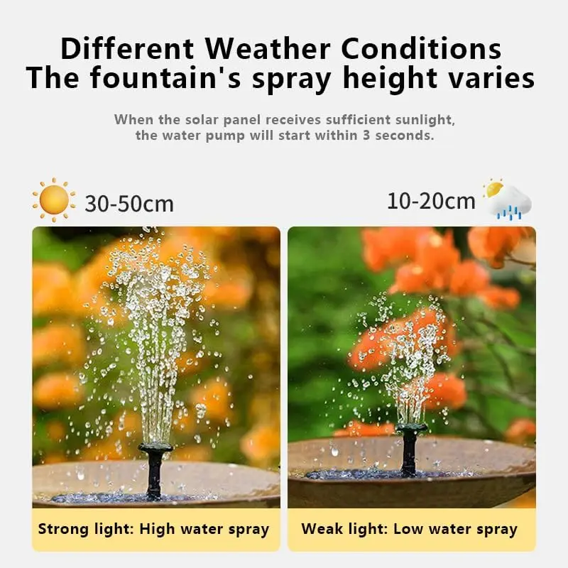 UPGRADED SOLAR FOUNTAIN FOUNTAIN: This solar birdbath fountain is made of high quality solar panels, no batteries or electricity needed, just place the fountain in direct sunlight, the solar birdbath fountain will run automatically in direct sunlight in just 3 seconds, the height of the water column jets can reach up to 30-40cm under the strong sunlight, which will attract a large number of hummingbirds to your garden and add vitality to your garden!