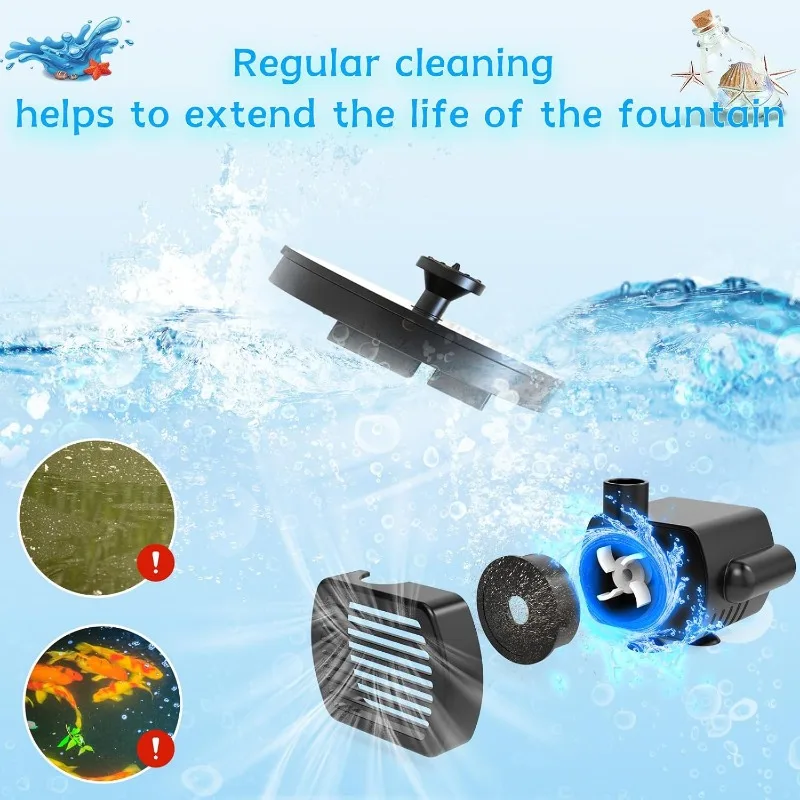 MOVEMENT PREVENTION DESIGN: We designed 4 anchors for the upgraded bird bath fountain, these anchors can fix the fountain in the middle of the birdbath, preventing the fountain from spraying water out of the birdbath due to random movement, which also reduces the frequency of adding water to the birdbath.