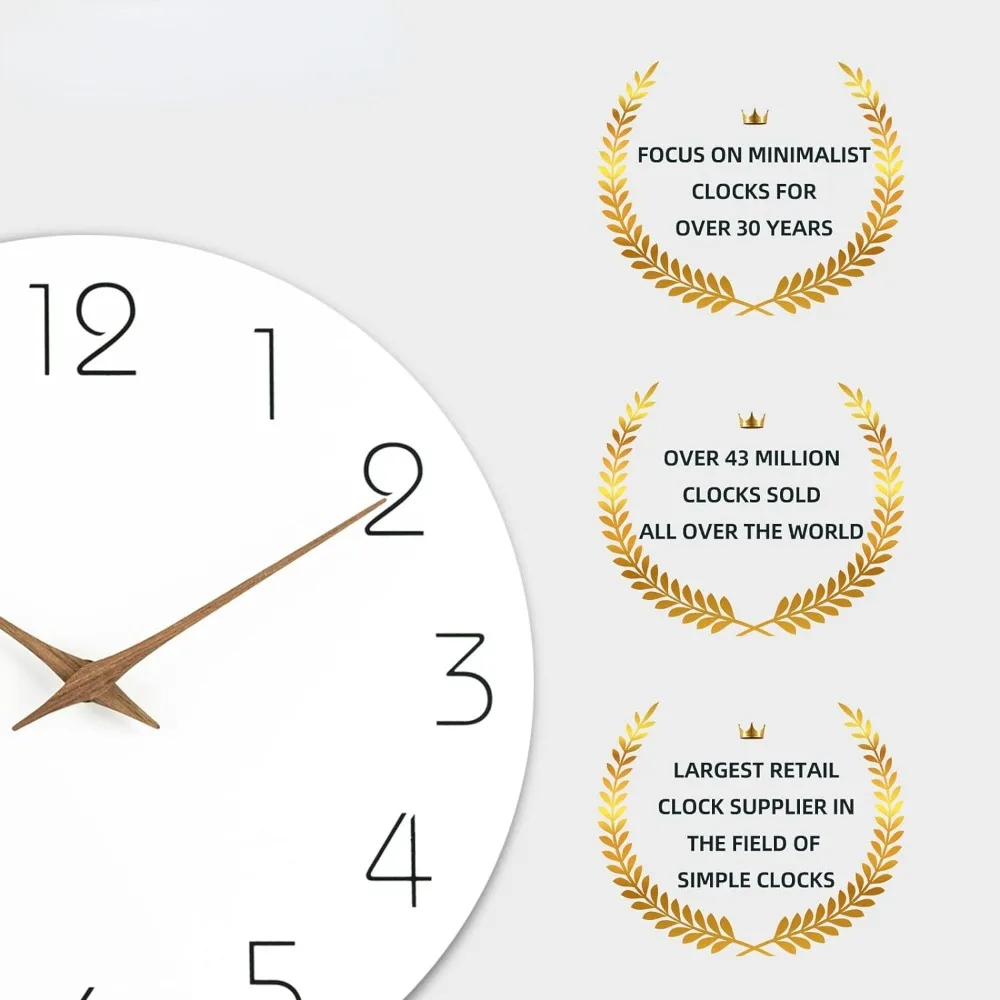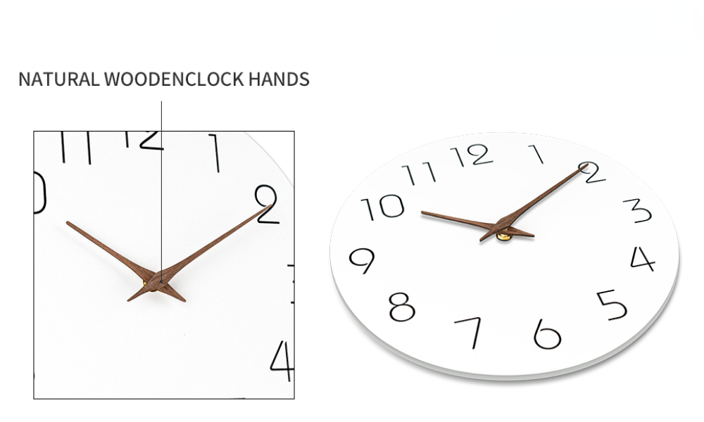 Made of white MDF clock face and black Arabic numbers, brown wooden hour and minute hands, no second hand, no frames and no glass