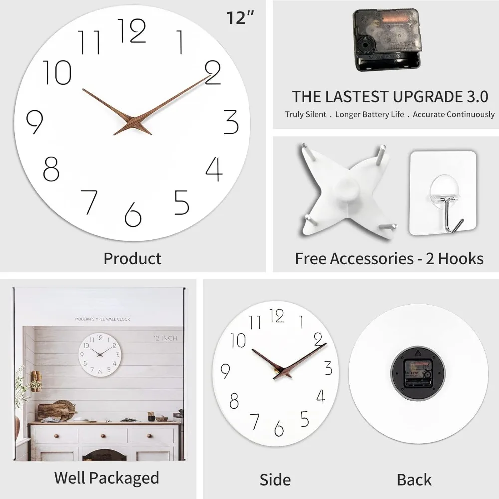 Wall Clock 12 Inch Silent Non Ticking Wood Wall Clocks Battery Operated Wooden White Modern Simple Minimalist Hanging Wall Clock